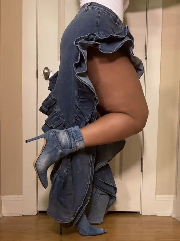 Step out in style with these Blue Patchwork Denim Boots. Featuring a pointed toe and stiletto heel, these booties are a chic addition to your wardrobe for a fashionable look.
