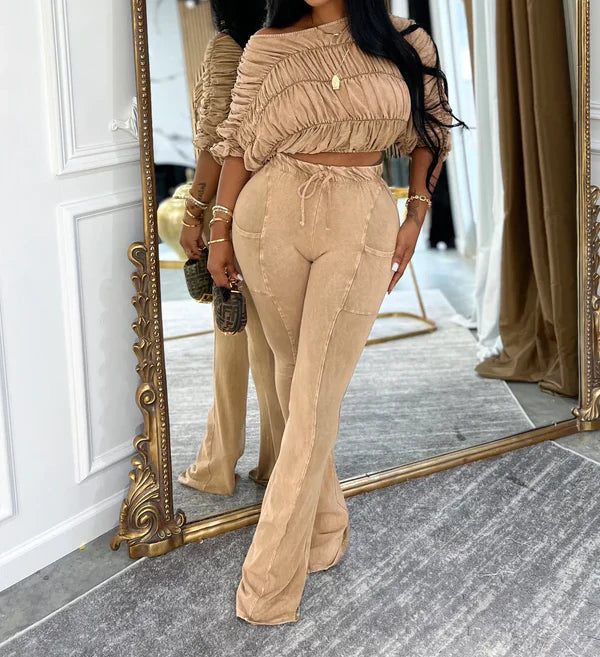 Model 5’2 wearing a size small has stretch 96% cotton 4% spandex Cropped oversized top elastic waist flared pants inseam 34”