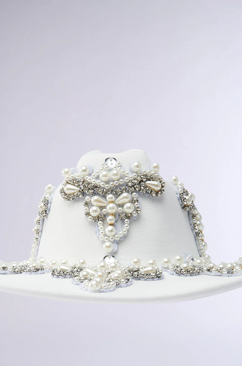 This glitzy western accessory features a felt-like base, a tall dimpled crown, a classic upturned brim, and gorgeous embroidered felt appliques adorned with rhinestone, pearl, and heart-shaped gemstone accents scattered across the top.
