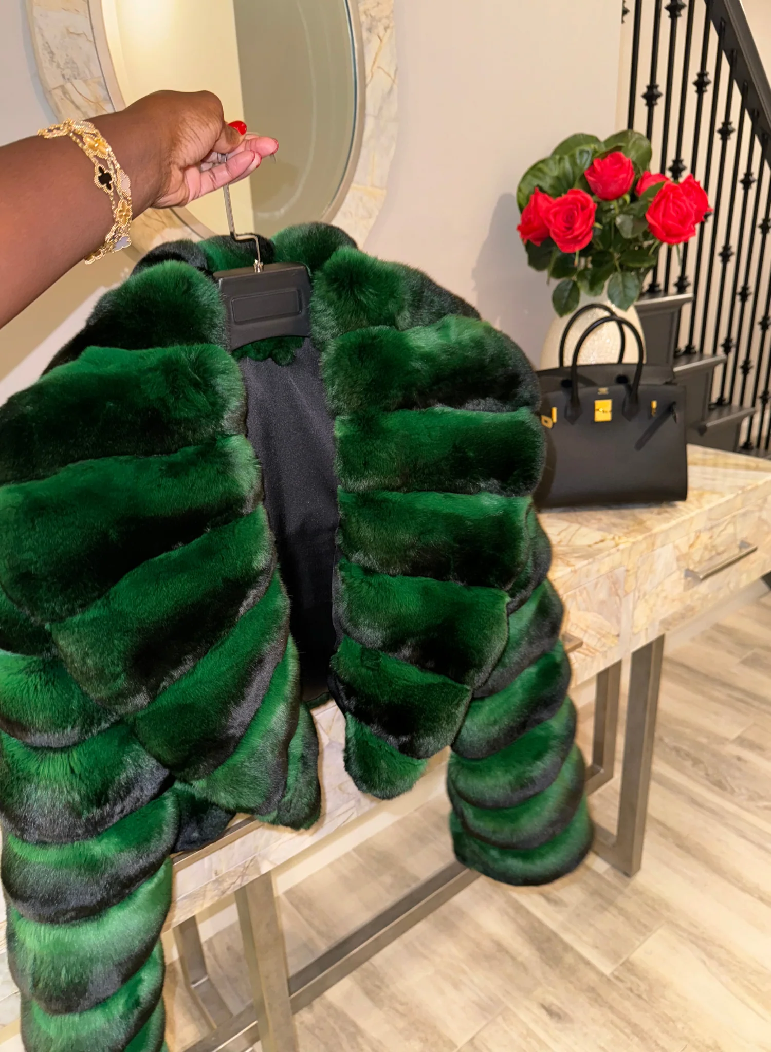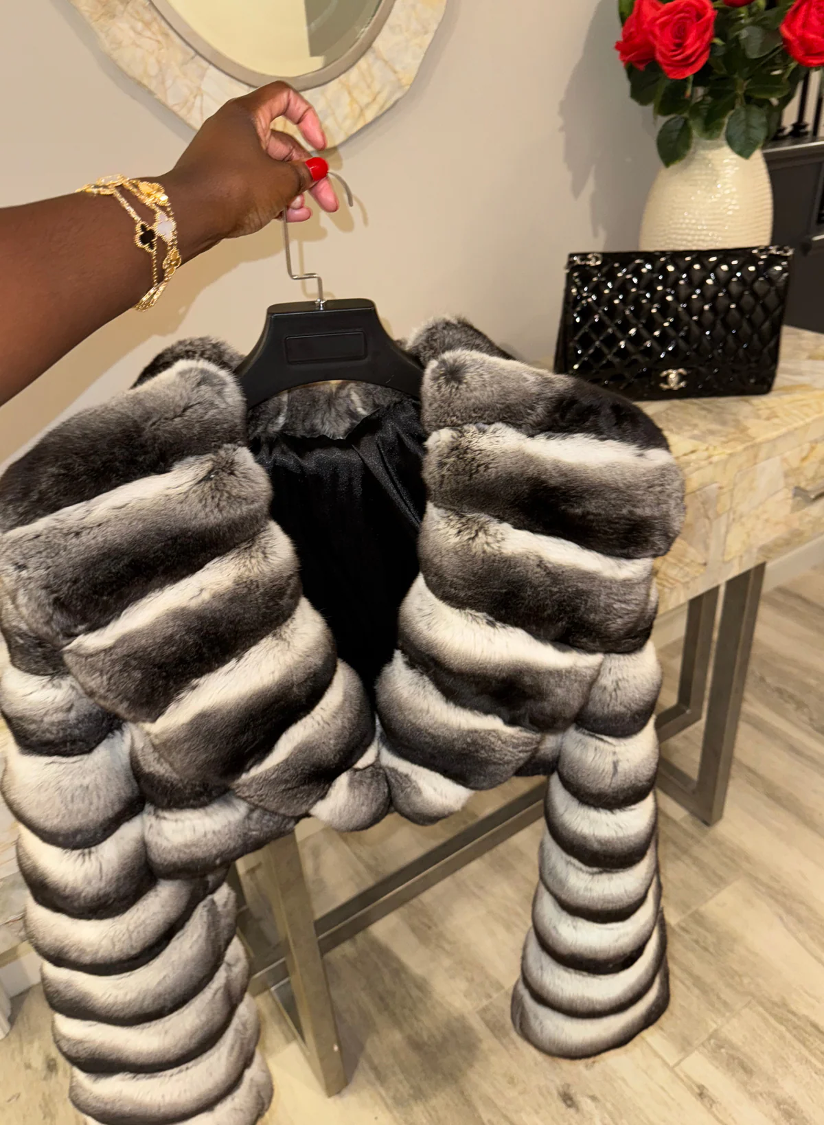 It features hook closure. This chinchilla runs true to size.