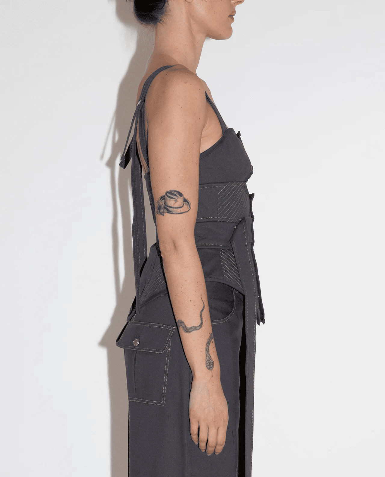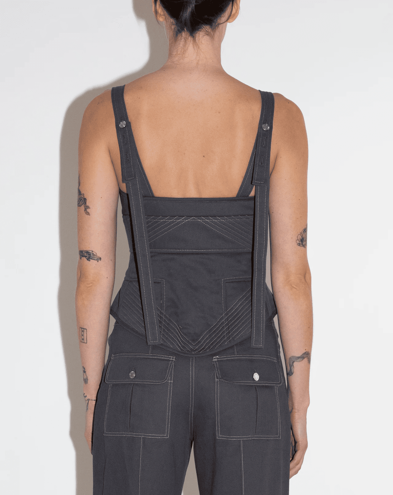 100% cotton denim button up bustier with adjustable straps, bias binding.