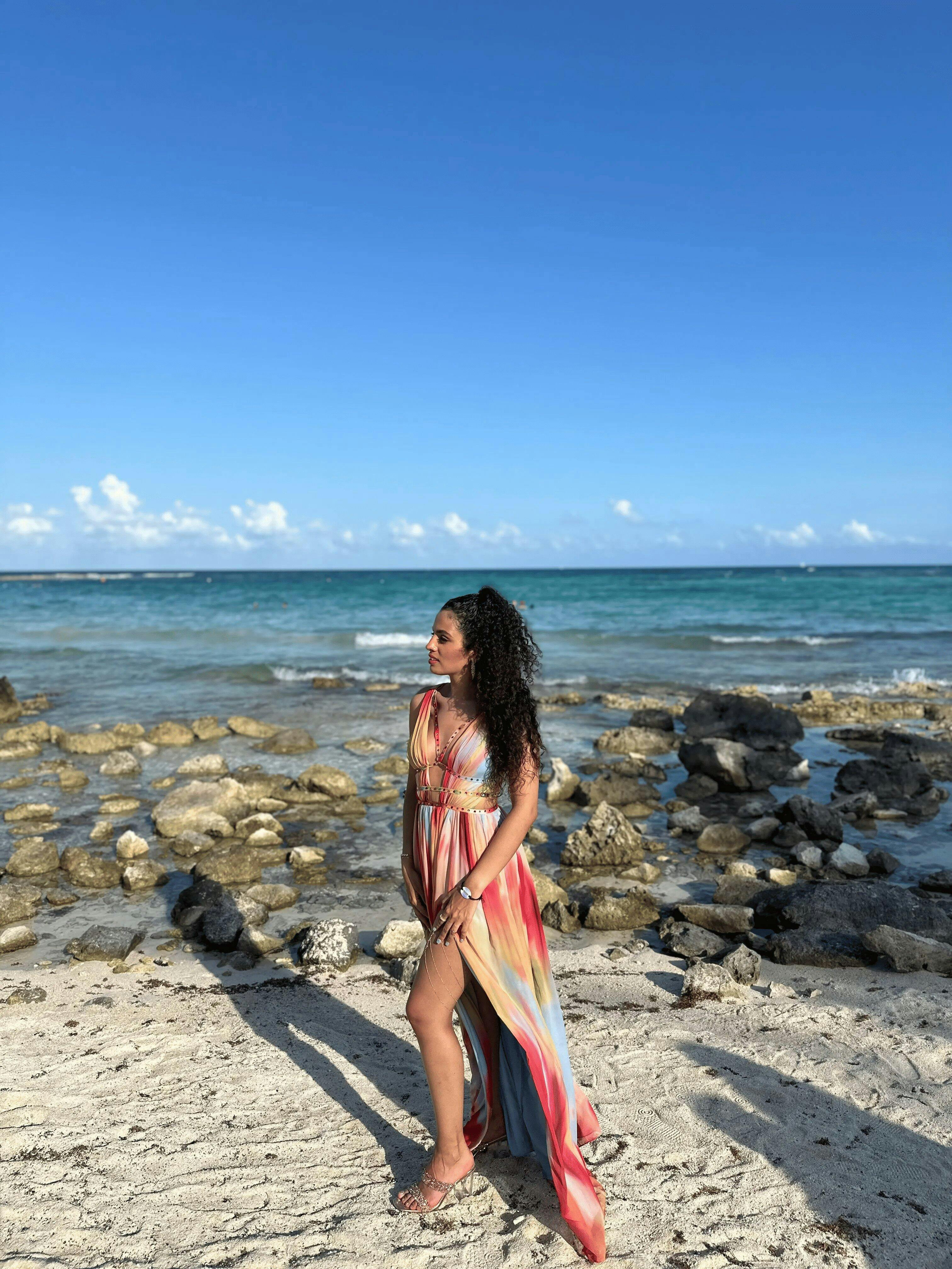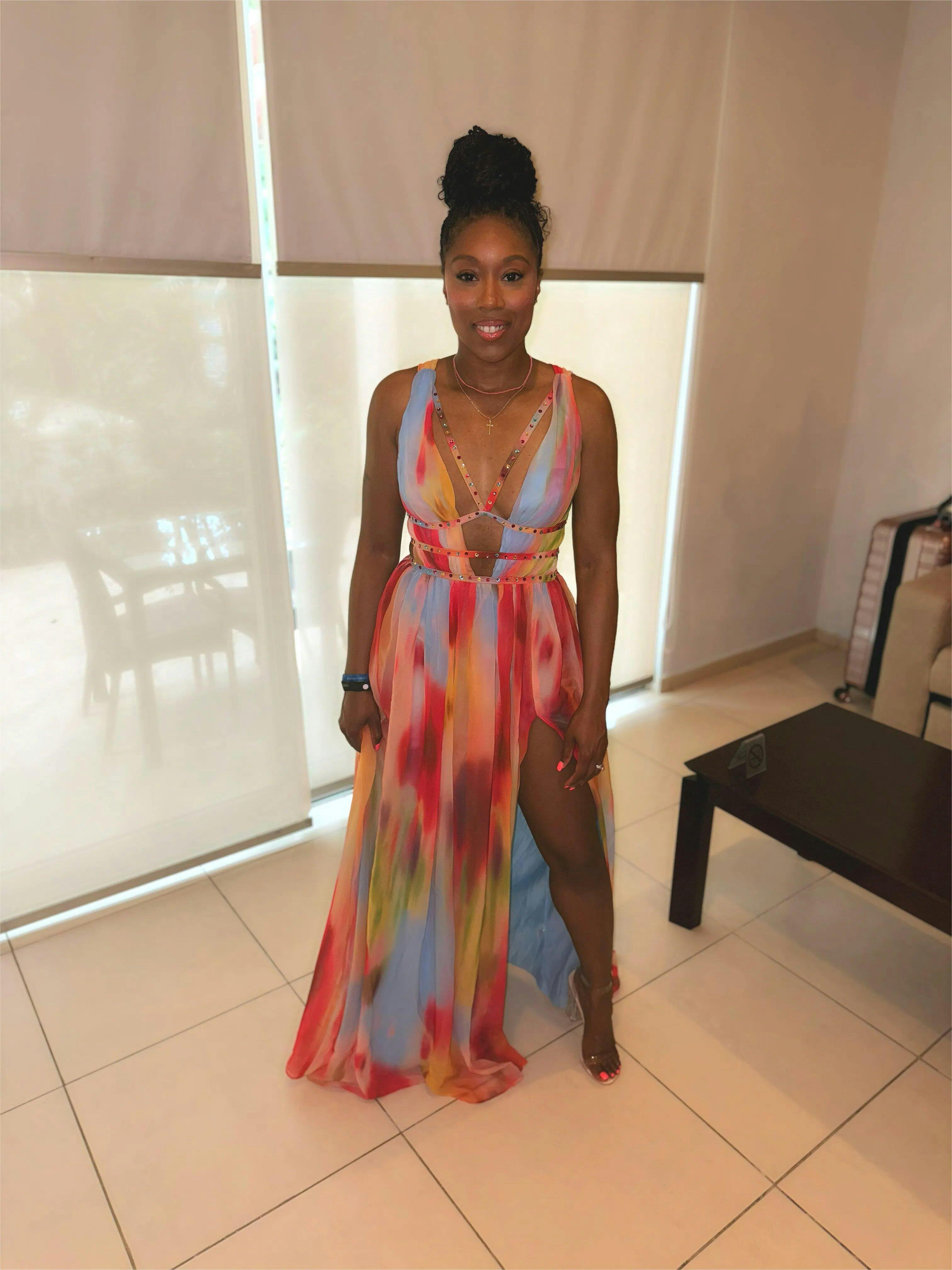 With the Eileen Printed Strapless Slit Maxi Dress, you're stepping into a world of beauty and sophistication. This dress is designed to make you feel like a fashion icon, featuring a captivating print, a daring thigh-high slit, and a delicate chain detail that adds an element of sophistication to your ensemble. The lining offers a comfortable, body-hugging fit that enhances your natural curves.Wear the dress with strappy stilettos, a matching clutch, and statement jewelry.