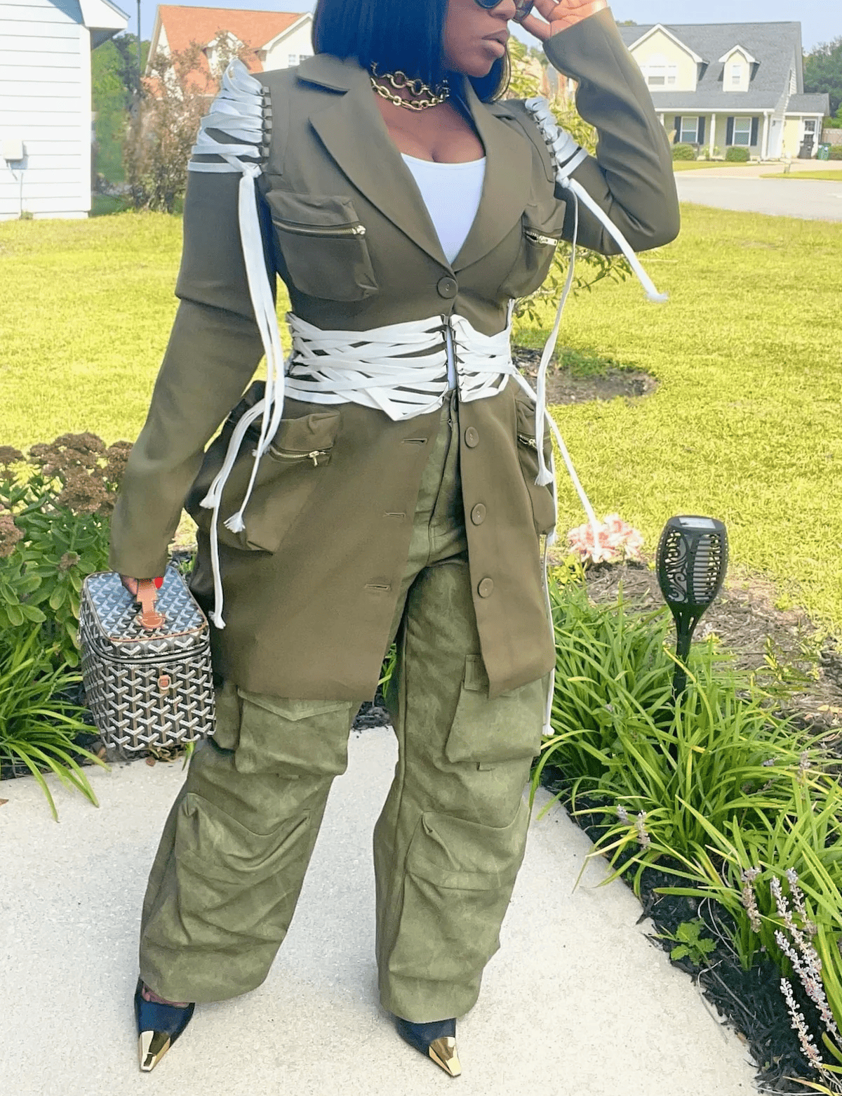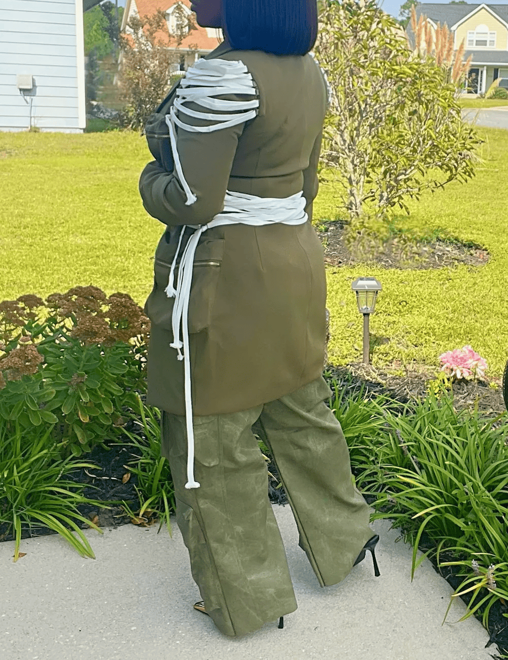 Command attention in this structured blazer dress & coat that redefines power dressing. Designed with utility-inspired details and elevated with dramatic lace-up accents along the waist and sleeves, this piece delivers both edge and sophistication. Whether worn as a dress or styled open as a blazer, it makes a bold statement every time you step out.