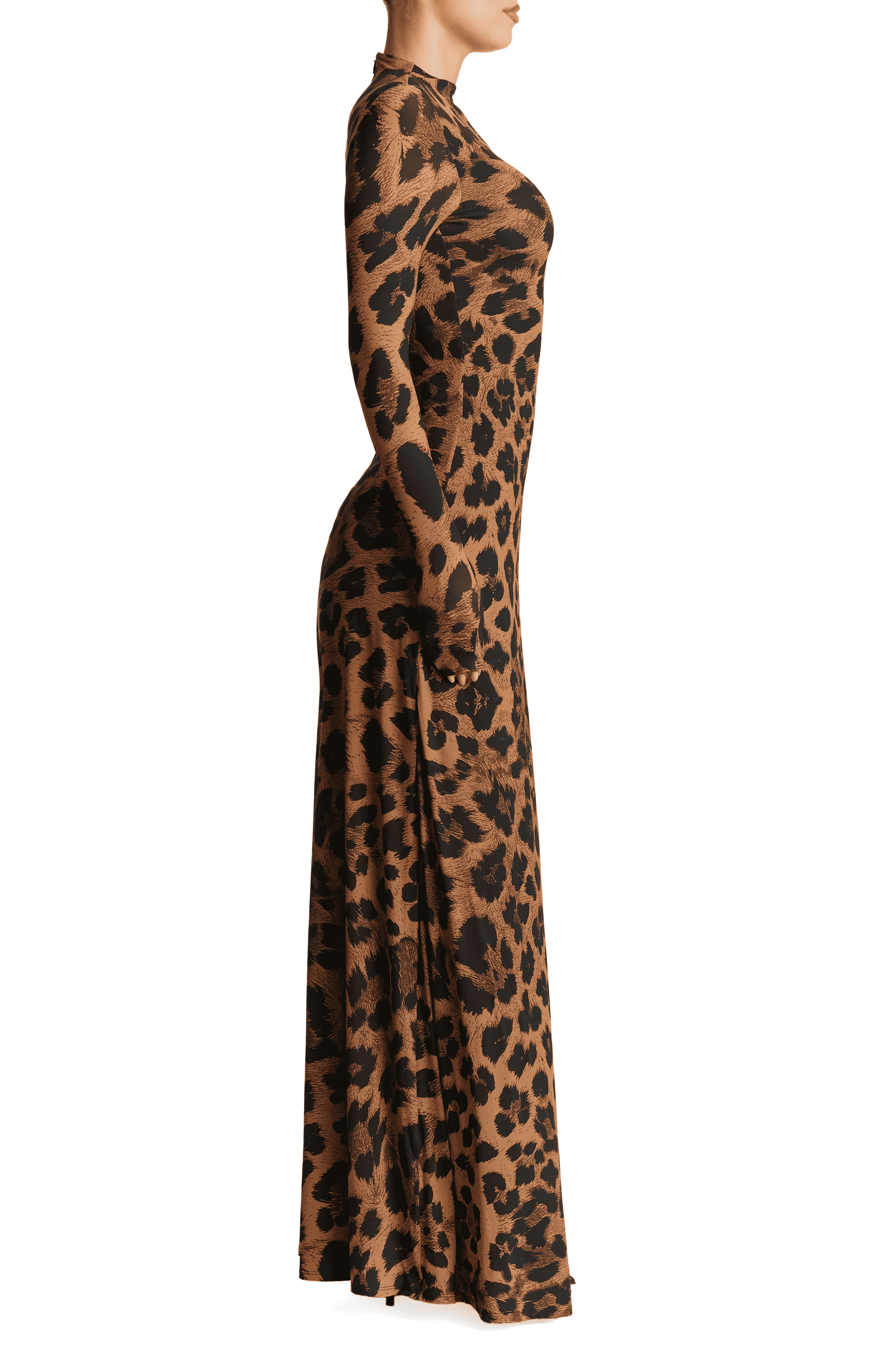 A stretch-enhanced construction is fitted at the bodice and flowy at the skirt of this chic leopard maxi dress that's sure to turn heads at your next night out.