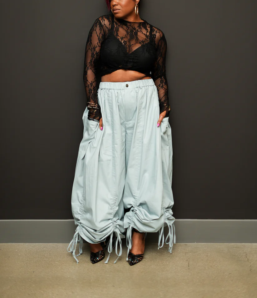 The Golden Flow Ruched Pants in blue bring a breezy, bold vibe to your wardrobe. Crafted from soft chambray, their wide-leg silhouette and adjustable ruched sides offer a flattering fit with a playful twist. Roomy pockets add practical flair, making these pants a Golden Chic essential for effortless style-whether you're turning heads at brunch or owning the day with casual cool.