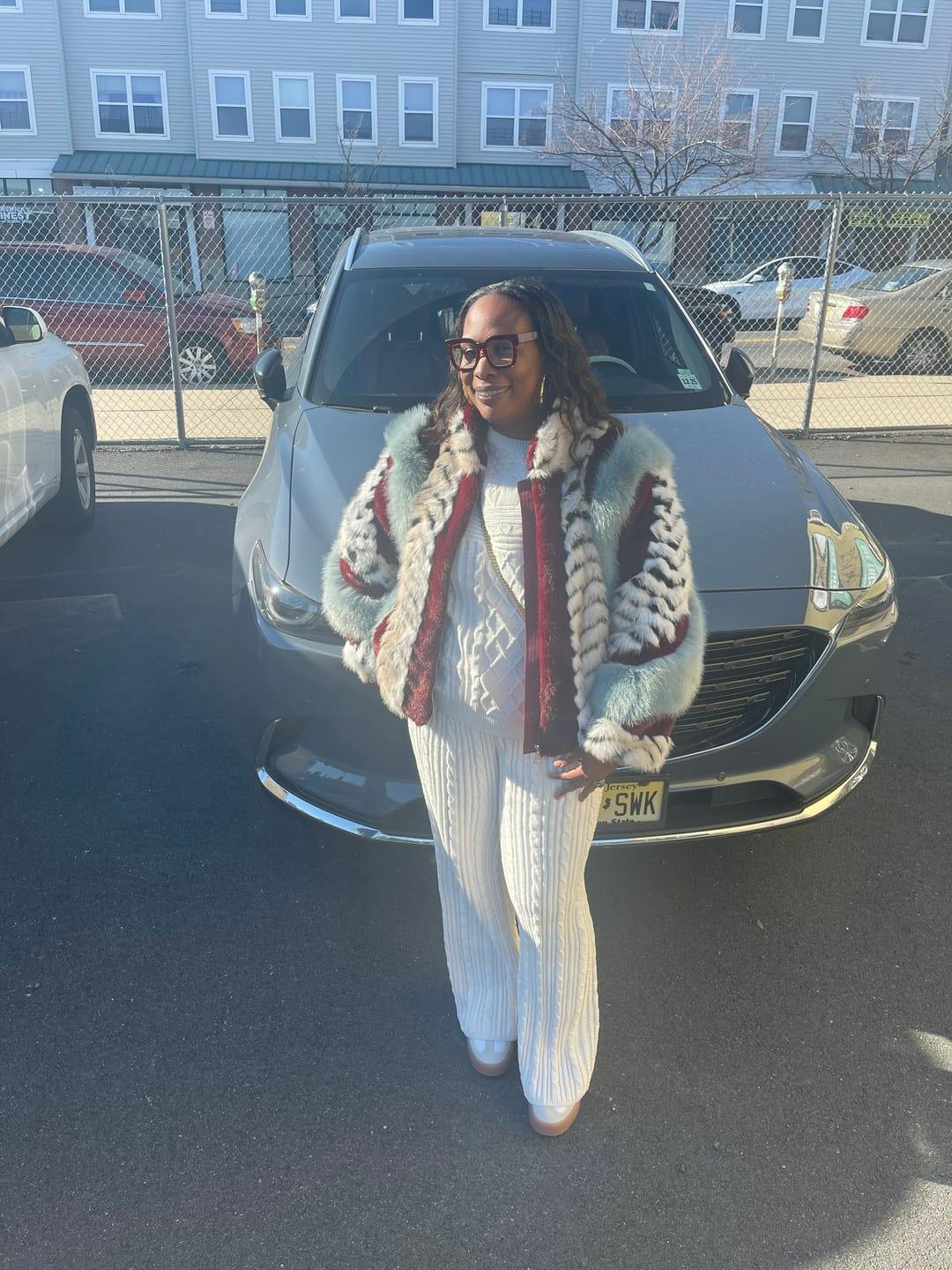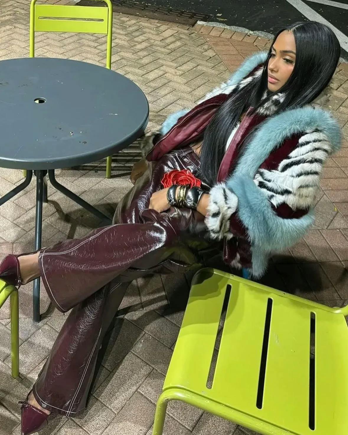This multicolored faux fur coat features a zipper design and eye-catching color-blocking in light blue, burgundy, black, and white. Pair it with matching faux fur boots to create a timeless look.