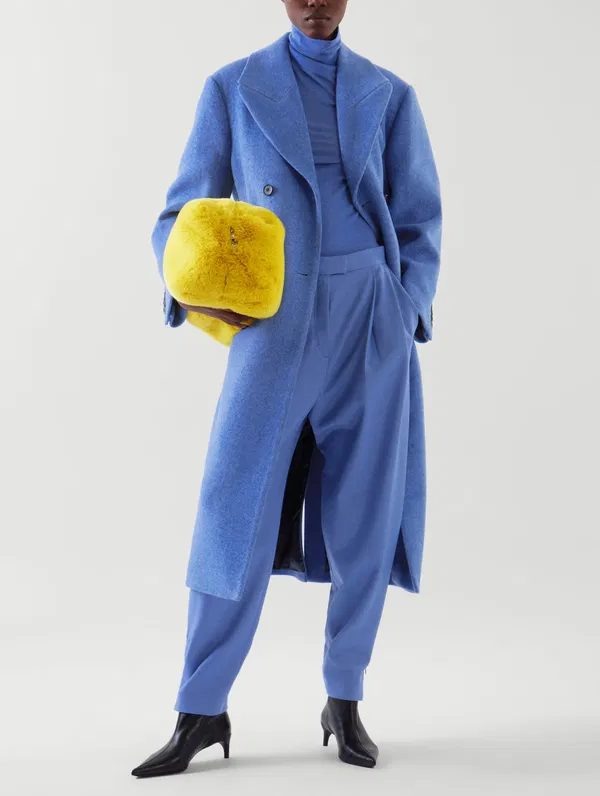 Sustainably crafted from recycled fabric, this oversized clutch bag features a tactile faux fur finish with a bold yellow tone for a statement-making accessory.