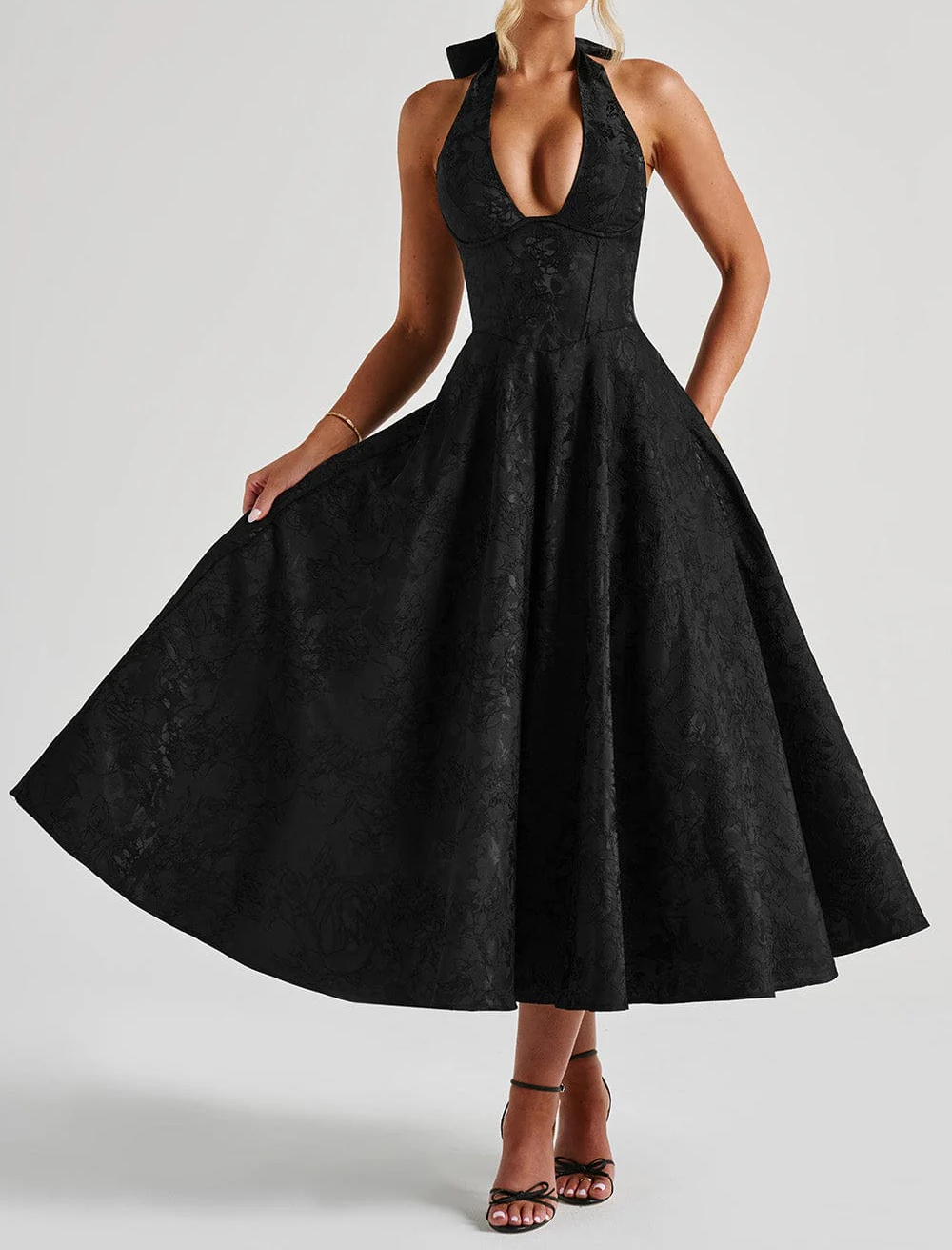 A show stopping dress that exudes romantic, timeless elegance - meet Effie. Offering a sophisticated silhouette, it features a full midi skirt made with tulle for added volume, and a super cinched bodice with boning to snatch the waist. With a plunge halter neckline and lace up back for your perfect fit, it's crafted in our luxe floral jacquard which feels super feminine and classic.