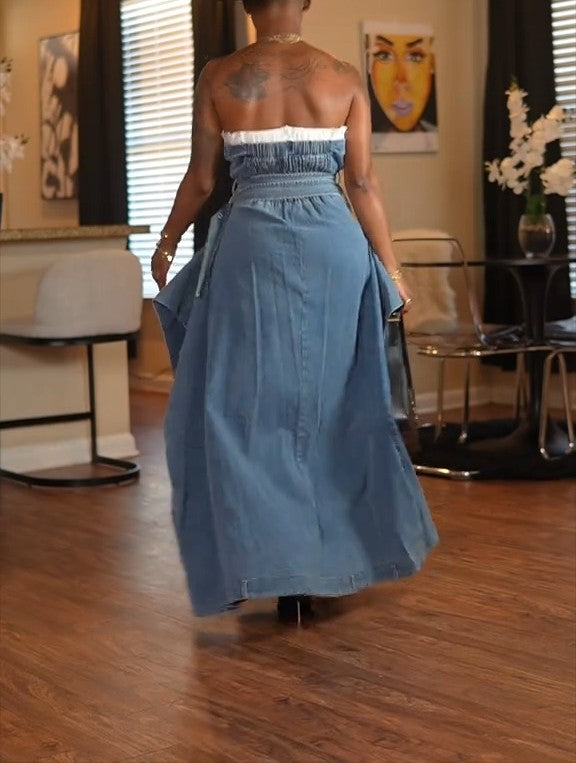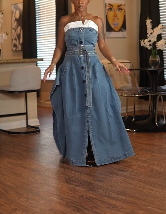 This dress is giving grown woman energy with a twist. The denim Midi Dress serves up structure and softness all in one—featuring a crisp button-up front, belted waist, and strapless neckline with a bold white contrast detail. It’s classy and sassy.