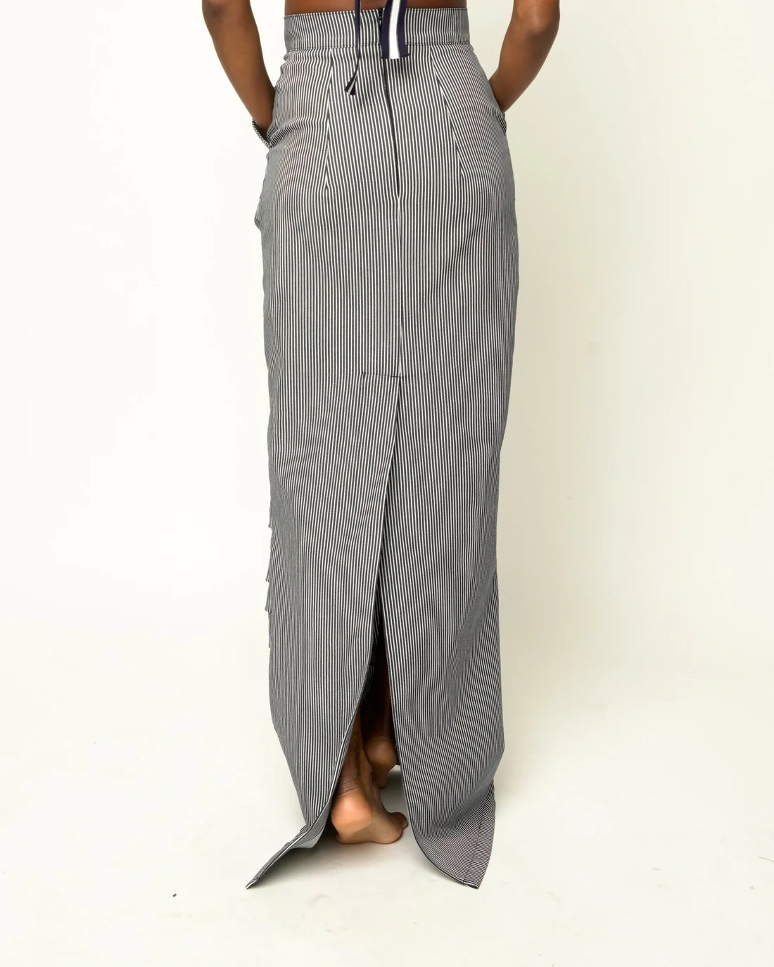 The Simpltrend is over look no further! We are obsessed with the Simpltrend Striped Maxi Skirt! If you love the form fitting design of a pencil skirt, The Simpltrend Maxi offers you the same fit and drama! Everyone will turn their heads when they see you wearing this number. Long vertical navy blue lines running from the waist, accentuating those flawless curves, all the way down to the floor…breathtaking! You just stole their breath. Designed out of a cotton twill fabric with rouching all the way down…it’s giving nautical mermaid vibes. And because she is so fitted, we added a discreet zipper in the back to slip on and off, as well as, a mid length slit up the back for ease of movement. There’s no reason you shouldn’t join the quest!